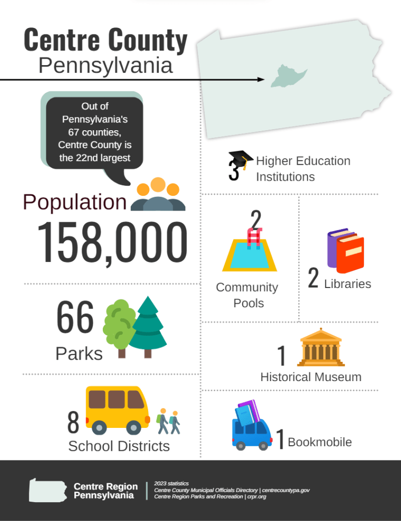 Welcome to Centre County, Pennsylvania where you’ll experience each of the four seasons as you drive up the mountains, over the hills, and around the trees. Named for its central location in Pennsylvania, you’ll find employment, dining, and a strong sense of community in the countryside of Centre County.